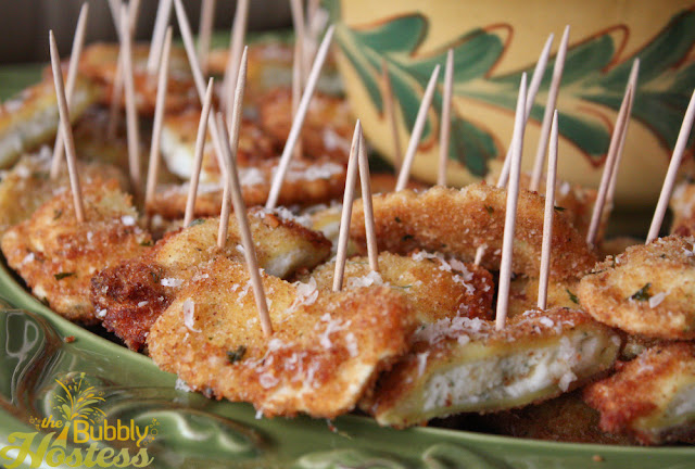 This was pretty easy to make – I prepared ahead of time and heated just before heading out of the house.  They would have been good in a chafing dish, but tasted great at room temperature too.  There was a lot of cooking in my kitchen over the weekend as we hosted dinner for others on Friday and Sunday – so on Saturday decided to not make it too much work and served the ravioli with a store bought marinara sauce for dipping.  Normally I would have probably made my own.