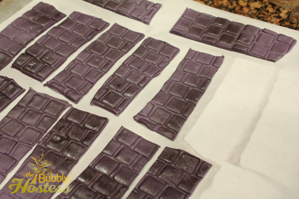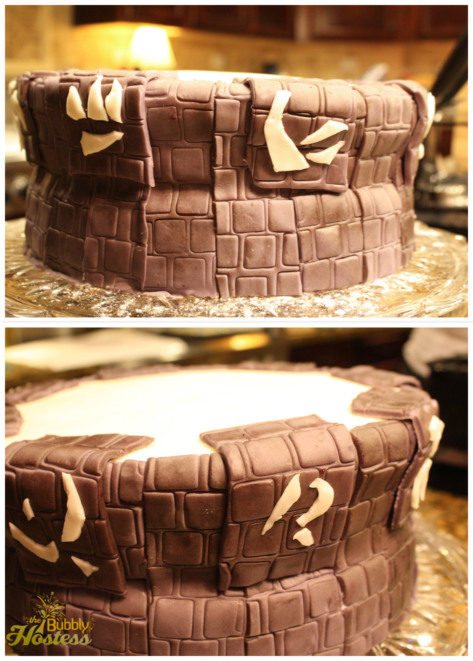 Once that was complete, I rolled out a massive sheet of the grey fondant. With the help of my bestie who was in town for the celebration, we started to create grey rectangles that would go around the entire cake. I measured the length I would need and started cutting the rectangles. These were transferred to a piece of parchment paper where she took the smallest square cutter to make light indentations in the stone. Once we had a large batch, we lightly sprayed them with black Color Mist Food Spray.