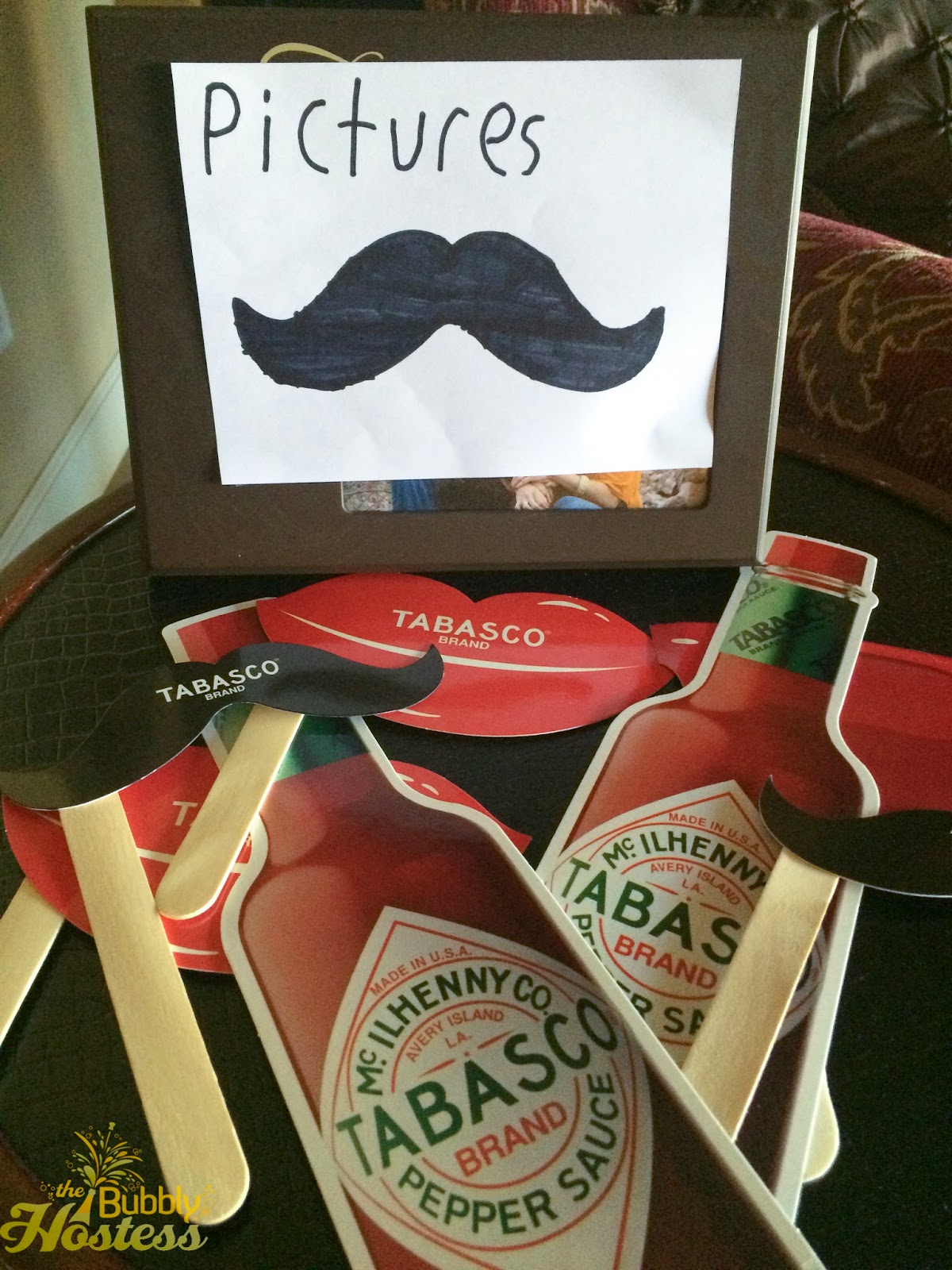 While prepping for the party Sunday morning, I asked my 8 year old son to get the contents of the party pack and and to place around the house. He went above and beyond with this task! Not only did he create different stations (like the picture station and cheering stand), but he also created 3 Tabasco-themed games….and to top it off – a schedule of events! The apple does not fall far from the tree…..