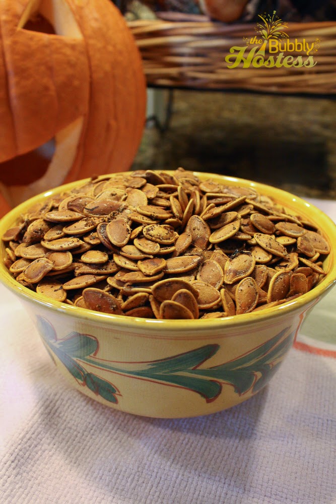 My family LOVES toasted pumpkin seeds – it’s the hubby’s job to make them each year. We do not follow a specific recipe – it all depends on how many pumpkin seeds you have and how you like them to taste!