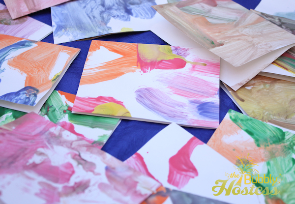 You can’t have a birthday party without also sending out thank you notes – they are so important to close out the festivities! For my little one’s Paint Birthday Party, I considered buying blank note cards and painting his hand to design each one. However, after the painting festivities at the party, a number of guests left their artwork behind. I decided to make thank you notes out of them. Not only a clever idea but one that was also earth-friendly.